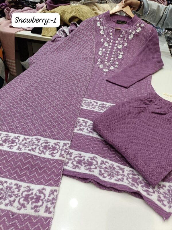 Woolen hairwool knited 3 pc set with pockets and neck embroidery